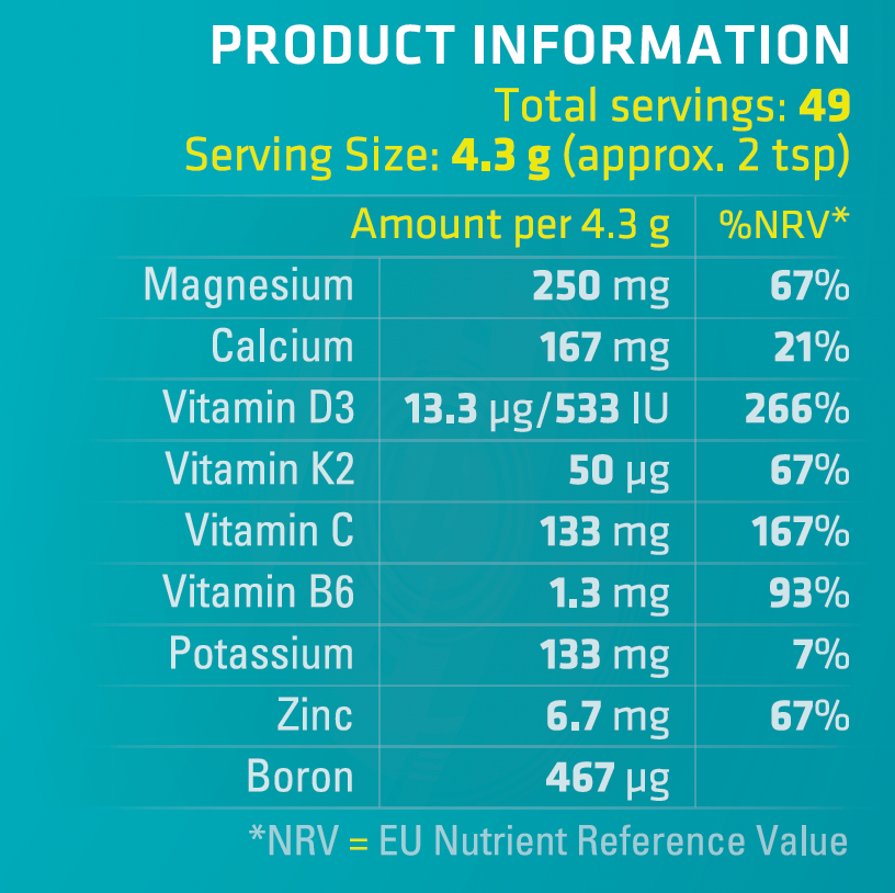 MAG365 BF Plus Calcium is a synergistic bone formula containing our awarding-winning MAG365 Ionic Magnesium Citrate Powder with the added goodness of calcium, vitamins D3, K2, C & B6, boron, zinc and potassium.